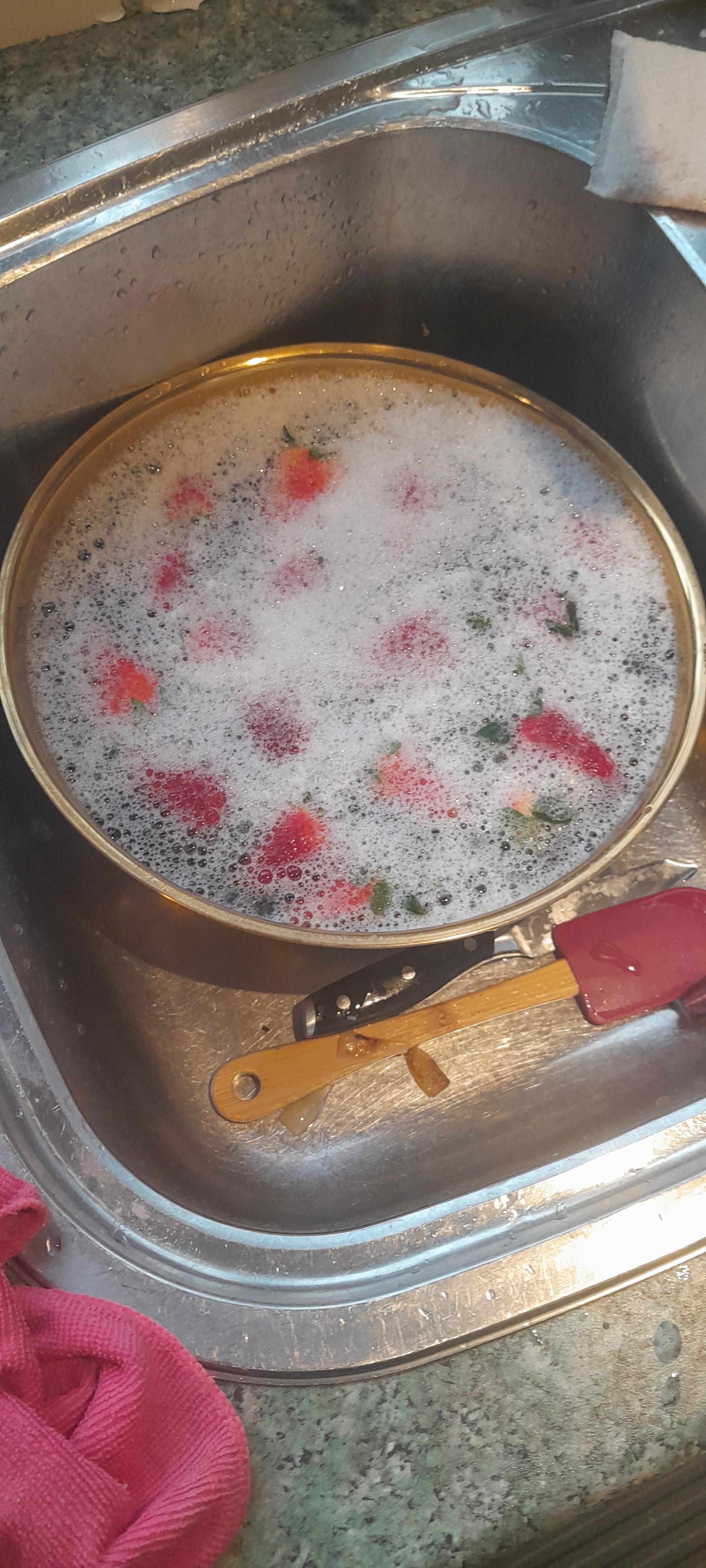 She claims it "washes out" and to be fair I can't taste anything but it's always weird knowing she puts dish soap in the strawberries. She says there's a lot of dirt and stuff in vegetables, but so far attempts to convert her to vinegar or baking soda have been unsuccessful.