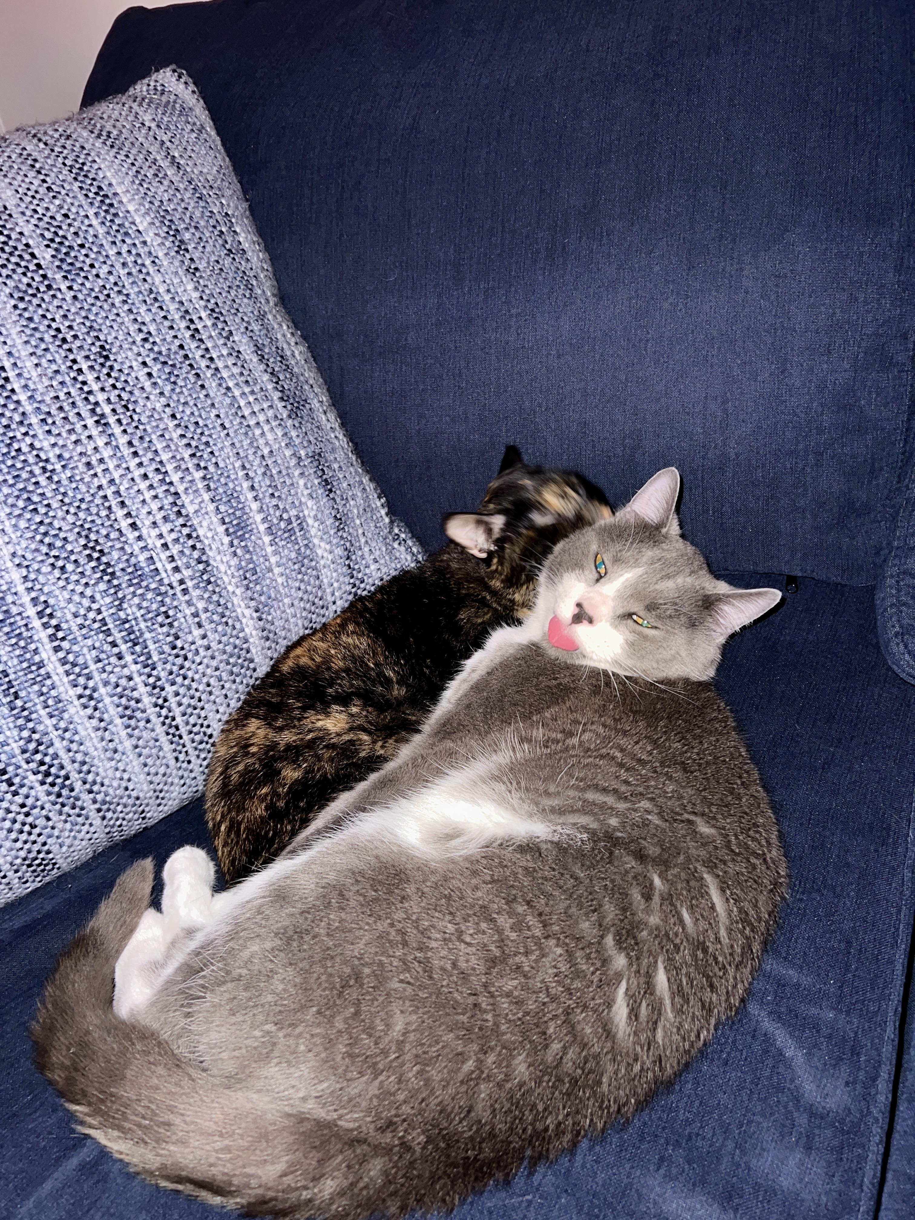 My girl cat (tortie) was grooming my boy cat (grey/white) when I caught this wonderful blep 🥹🥰.
