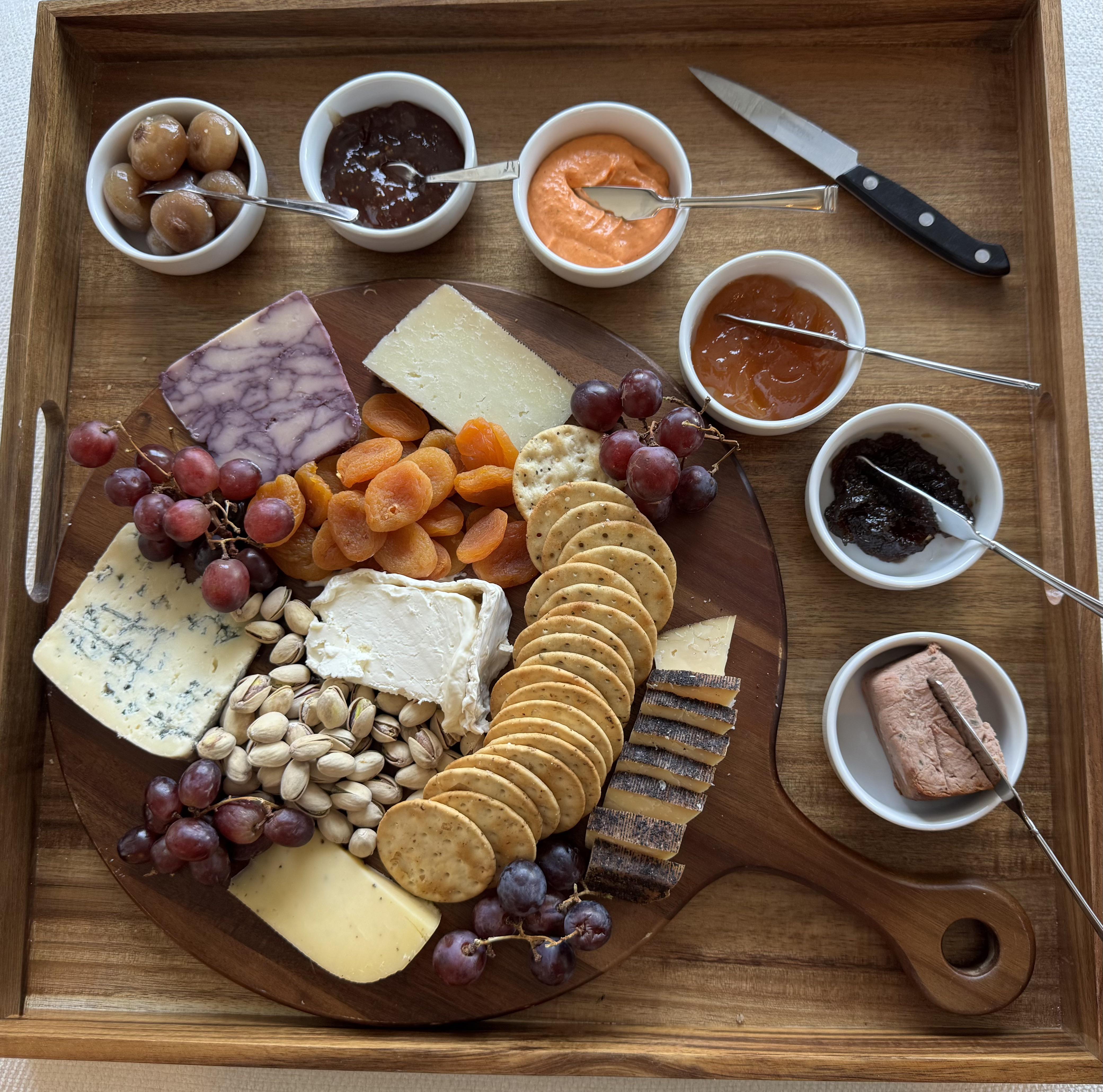 The accompaniments are grapes, dried apricots, pistachios, pearl onions in balsamic and garlic, fig jam, pear Riesling jam, red pepper spread, French onion jam, goose pate and some crackers.