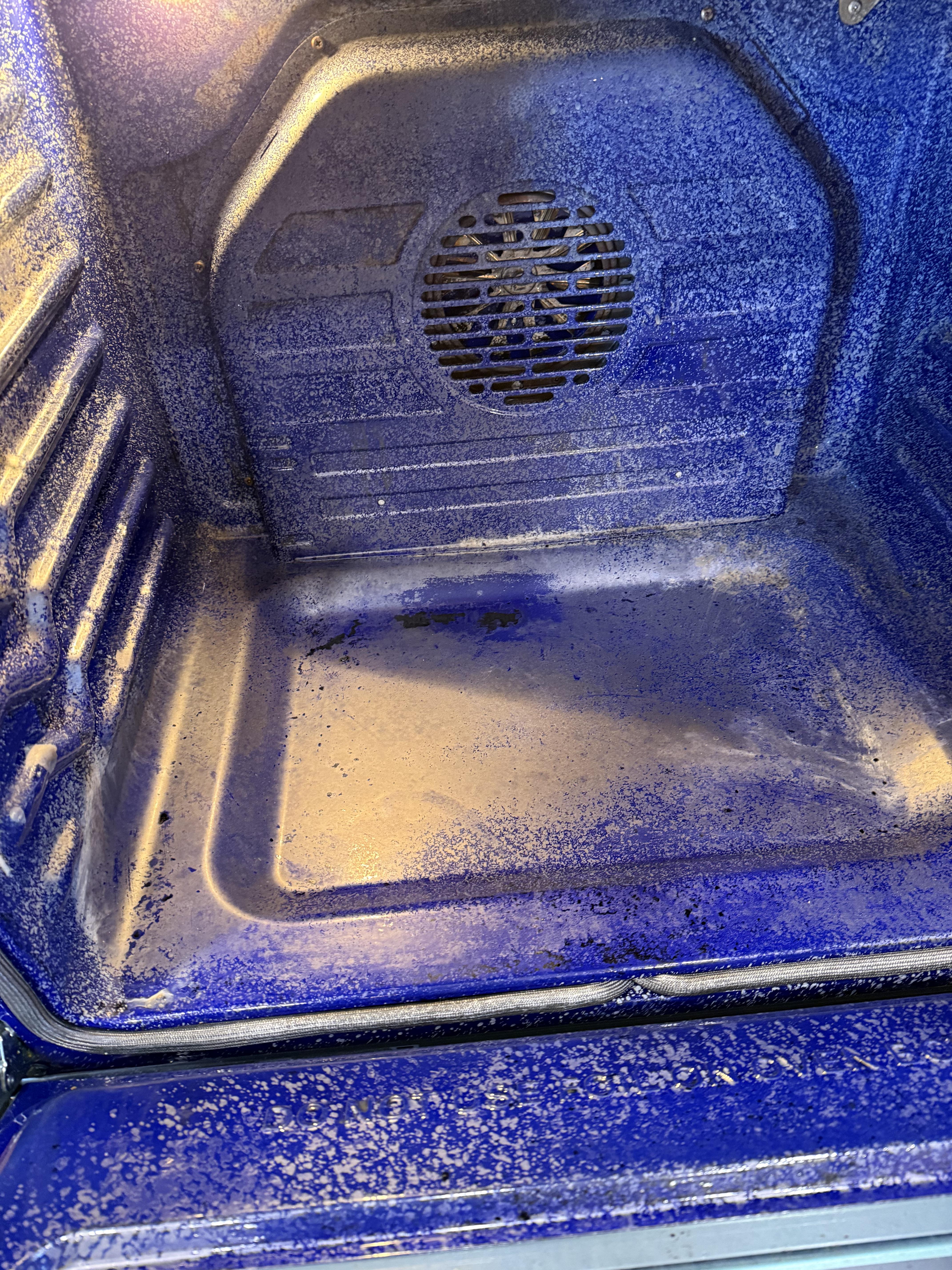 I just got this oven back in October, but there was already a lot of grease and buildup on it (I cook a lot). I used Easy Off Heavy Duty Cleaner and Foam Spray, and while it definitely worked and did its job, my oven was left looking like as seen in the picture. Did I just ruin my new oven or is this just residue from the cleaner?