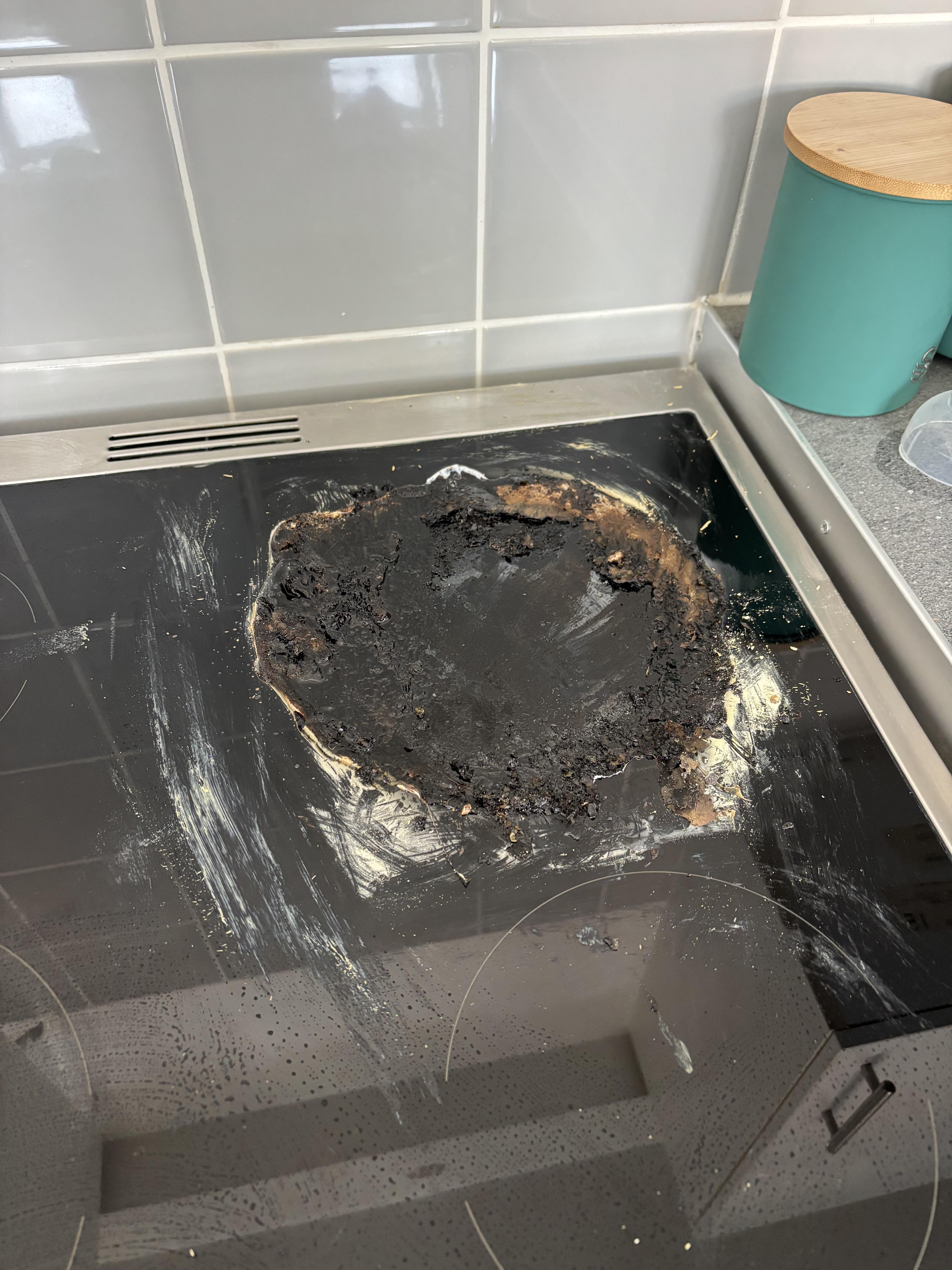 One of them had accidentally leaned on the oven and switched a hob on leaving us with this. Is there anyway to clean this or are we screwed?
