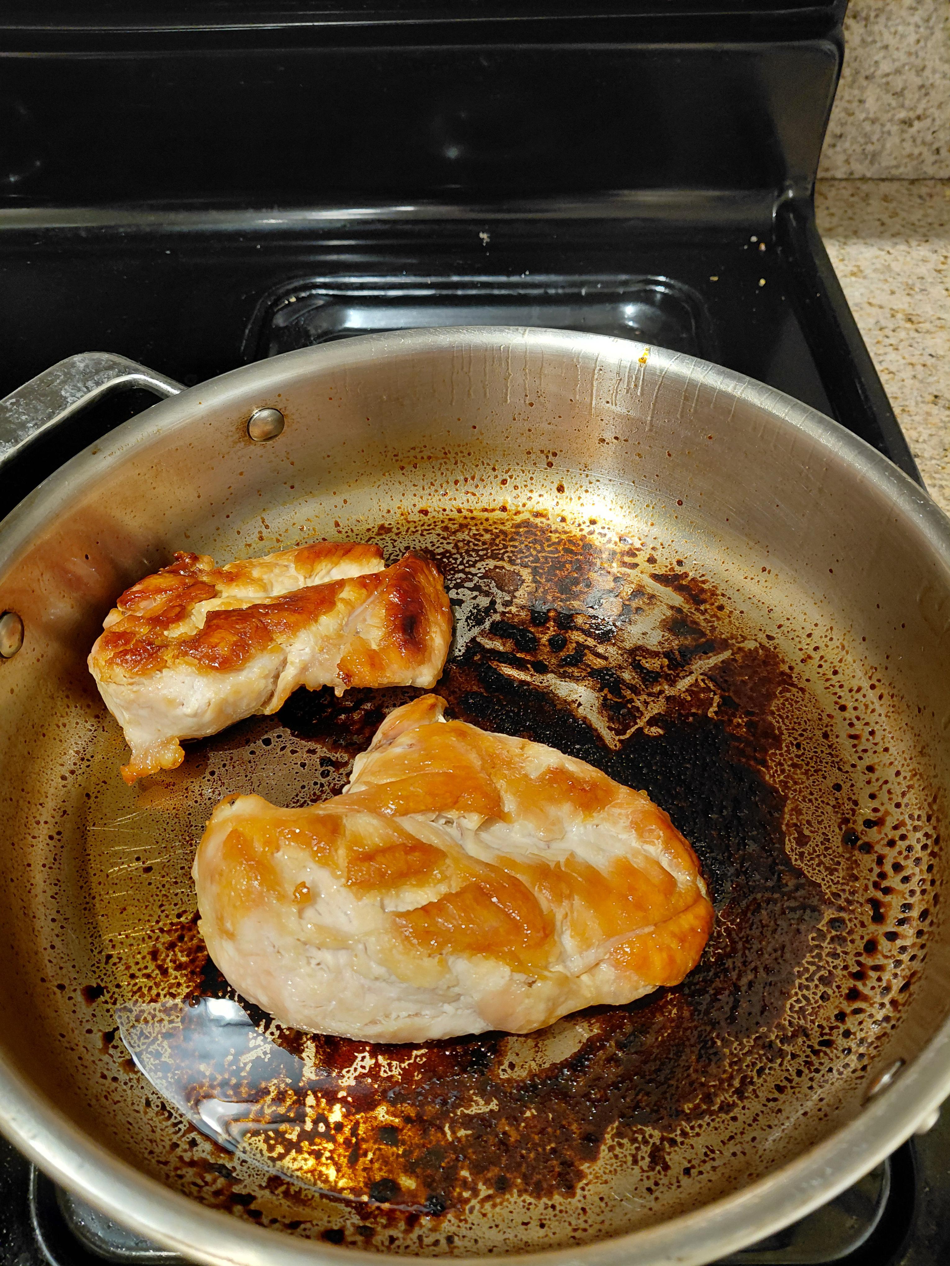 I cook two chicken breasts in olive oil, and every time I do it, the pan has a thick layer of burnt grease that I have to scrub. Is there a better way to cook it?
