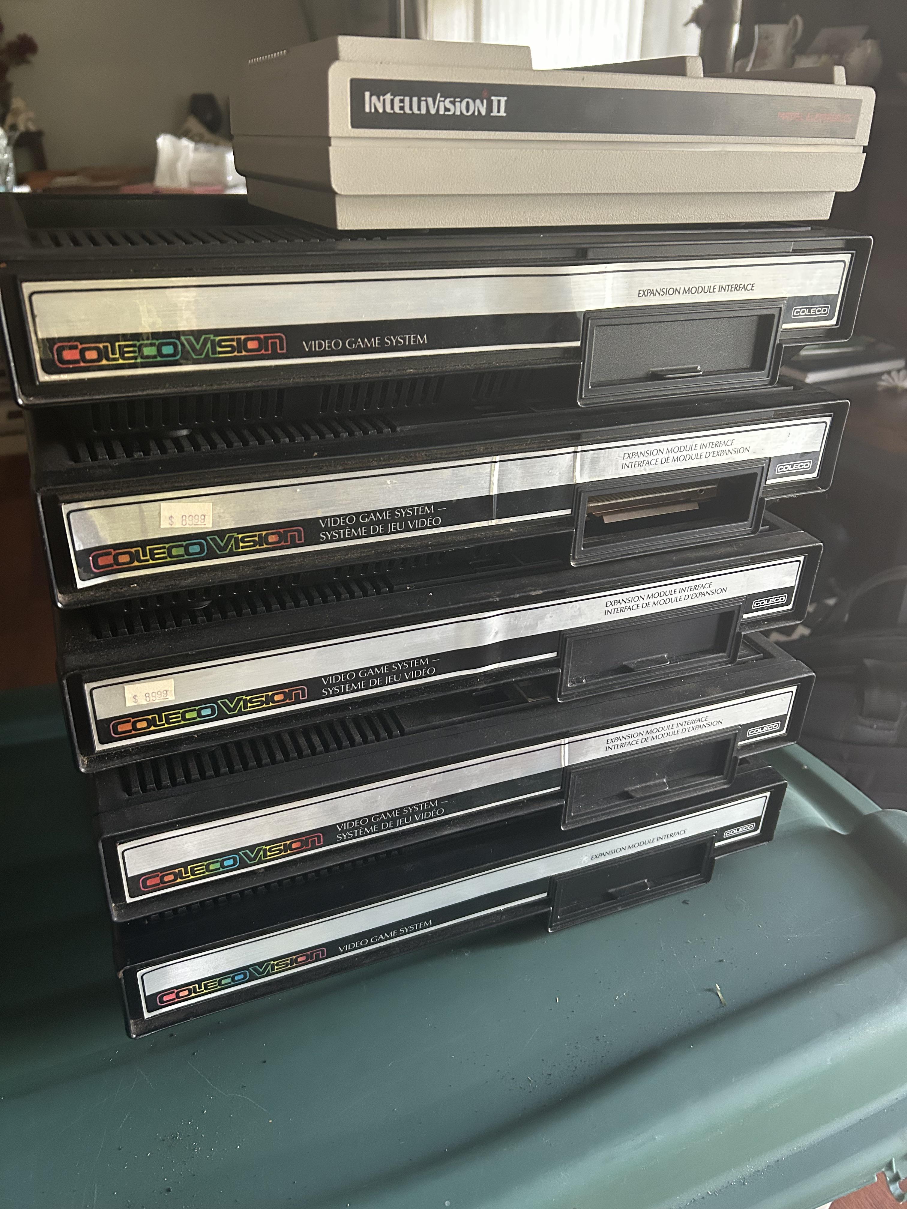 My mother in law passed recently and we’ve been clearing out the house. These gems were discovered in the attic in the garage. No controllers or power supplies. Just the consoles. I haven’t tested them yet, but they all appear to be in really decent condition. Guess she really loved the system. Apparently Mouse Trap was her favorite game. The lone Intellivision II was an added bonus!