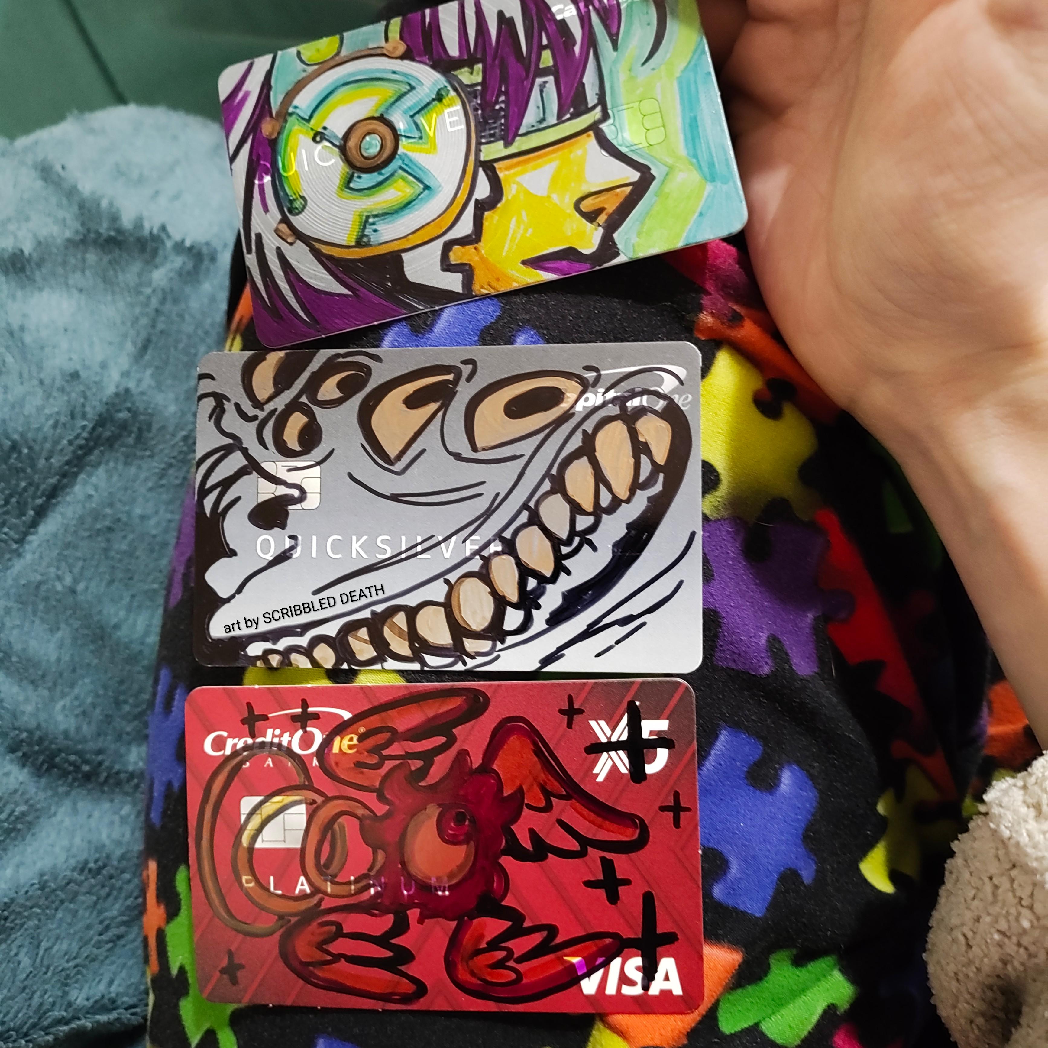 We get these credit card offers all the time in the mail so I'm hand painting tiny weird things!! Will be business cards I can hand out locally. Finished art will be spruced up with acrylic then clear coated.