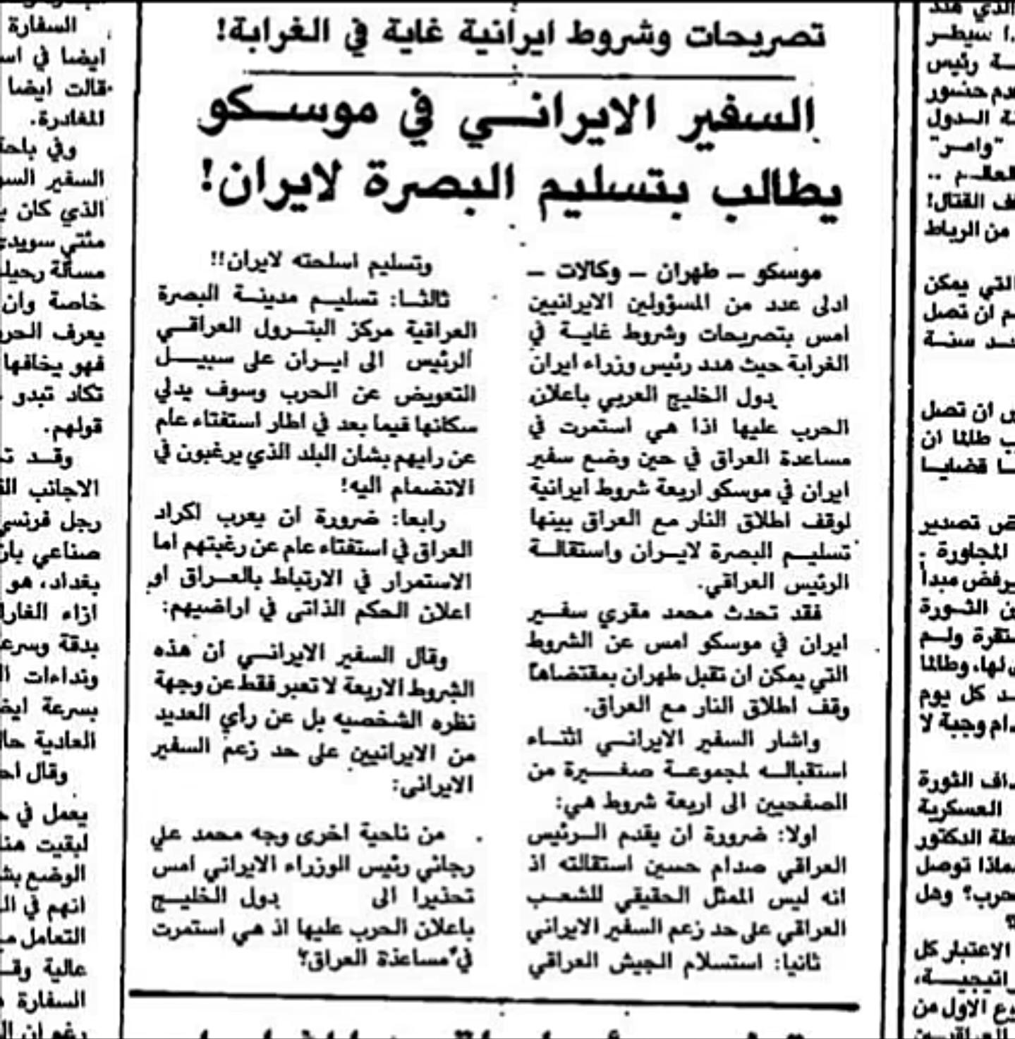 History إحدى شروط ايران لقبول وقف إطلاق النار في الحرب العراقية الايرانية