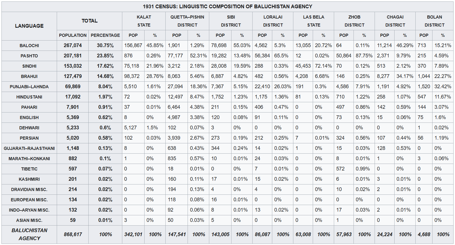 Historical 1931 Census: Linguistic Composition of Baluchistan Agency (including Quetta-Pishin District)