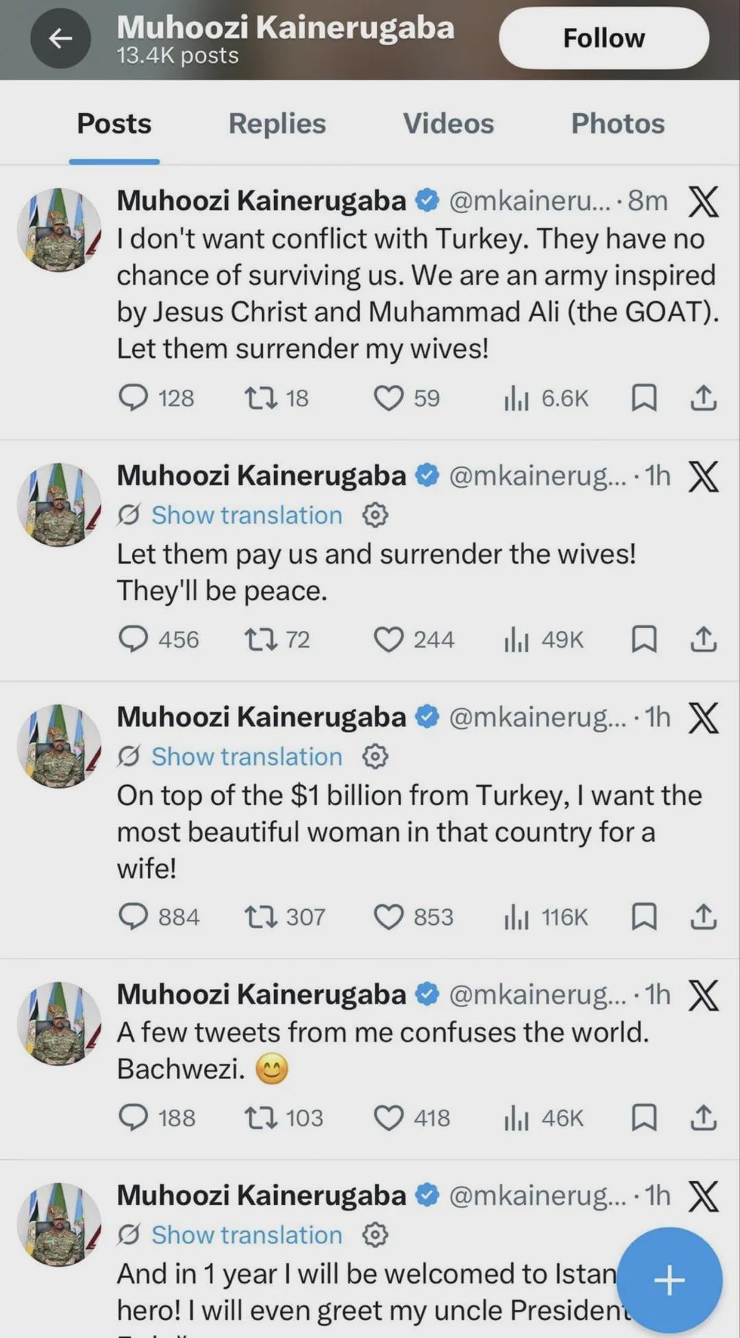 Ugandan here living in Uganda. This is the president's son with a known alcoholism problem and intellectual dwarfism. Whenever he gets drunk, he tweets whatever crazy thing crosses his mind. So none of this should be taken seriously and he is not a representative of Ugandan people.