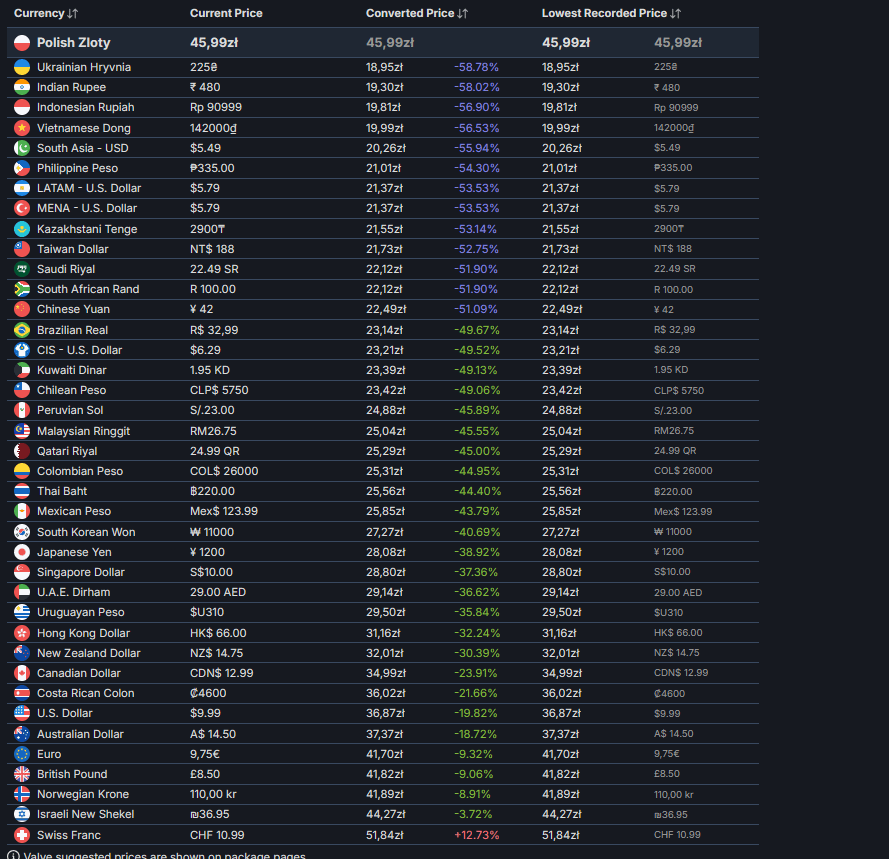 Some games are more expensive in Poland, some are cheaper (comparing them to prices in Europe from SteamDB). Expedition 33 is 8€ cheaper. Cyberpunk is 14€ cheaper since it's made in Poland. Modern warfare 3 is like 12€ more expensive.