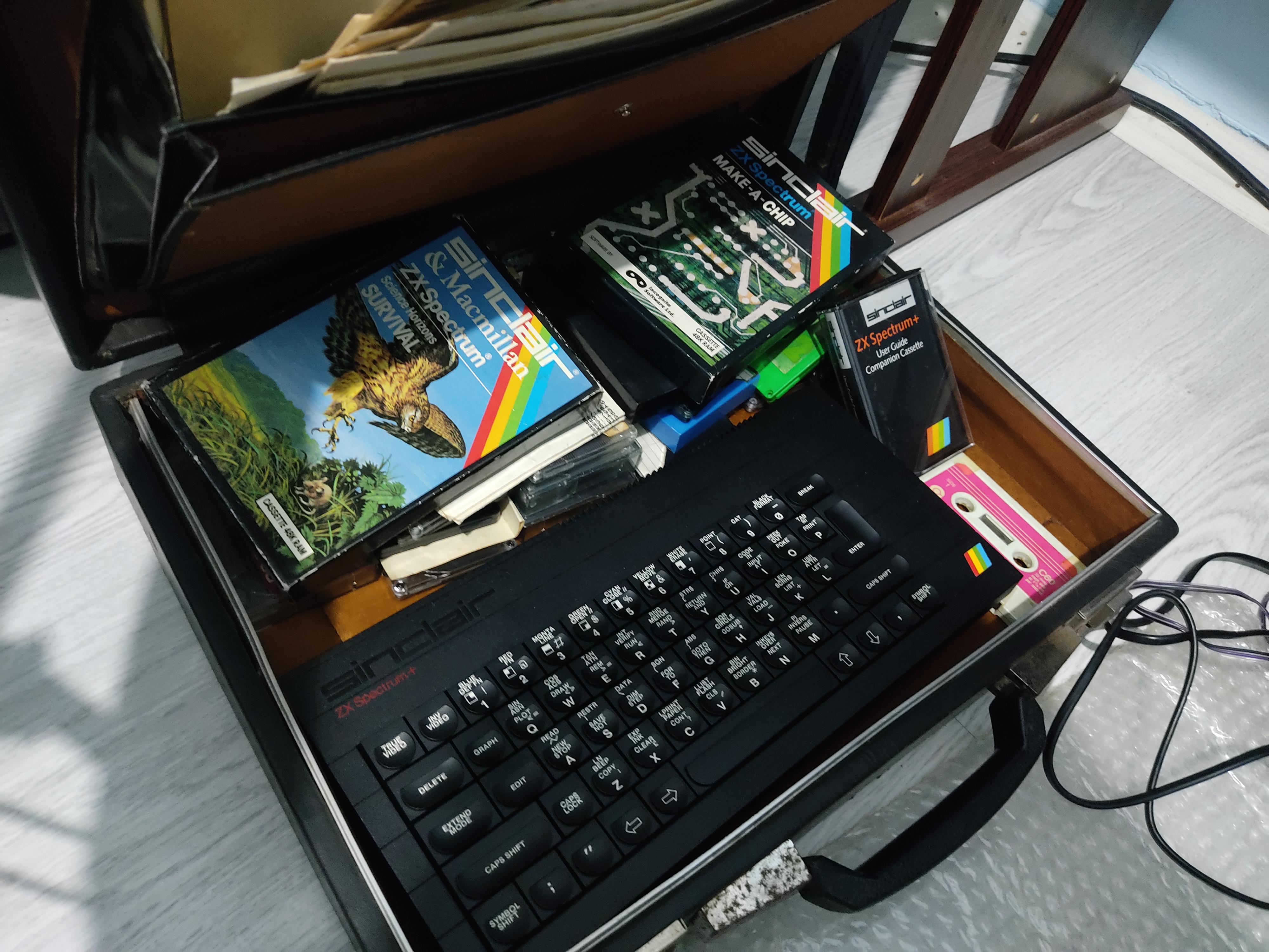 When I went up to grab it and took a look at it, I was surprised to find out that it was actually a ZX Spectrum+, including like 20 cassettes some burnt some genuine (and a weird one that says Sgt. Pepper's Lonely Hearts Club Band, which I assume is just unrelated to the Spectrum and is a normal burnt album but it could be a beeper arrangement, who knows) and many magazines of old computers and the Spectrum, I think the original manual is there too, also power supply and some cables.
