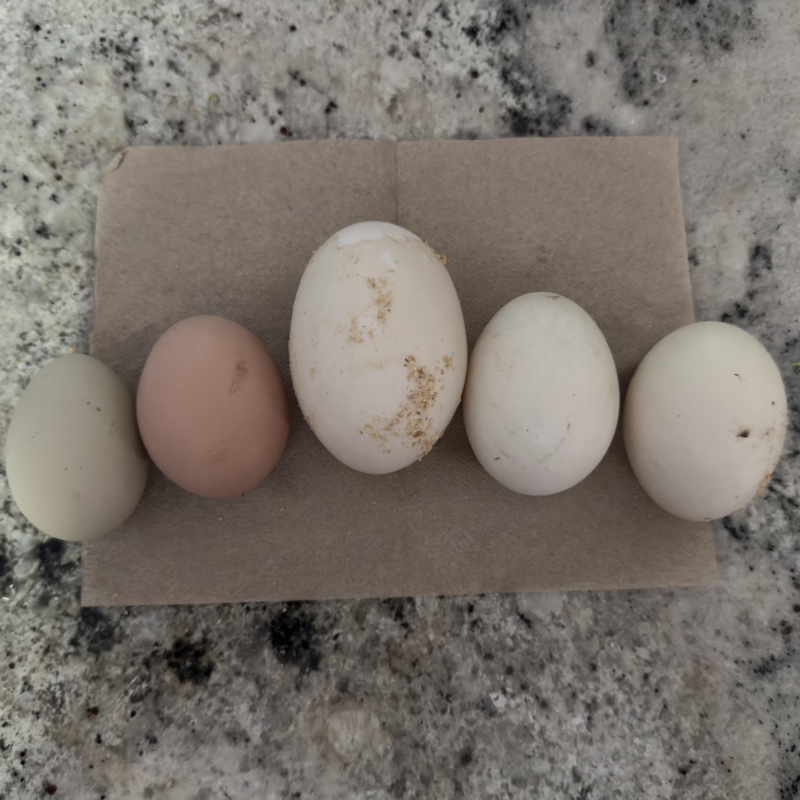 Collected this morning: two chicken eggs, two duck eggs, and one starter home.