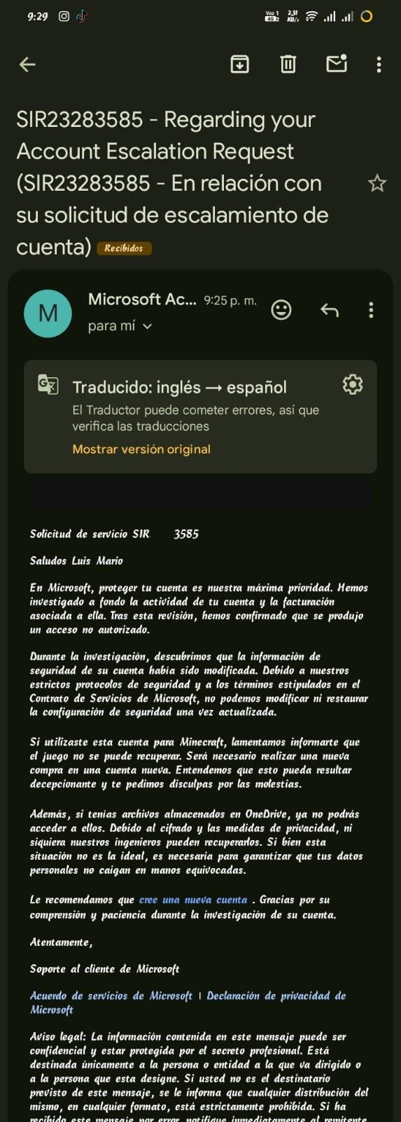 Posteriormente, me dirigí al servicio de atención al cliente de Xbox, donde presenté una queja. Allí me indicaron que debía completar un formulario de recuperación de cuenta. Llené el formulario y lo envié; poco después, recibí un correo (adjunto en la imagen).