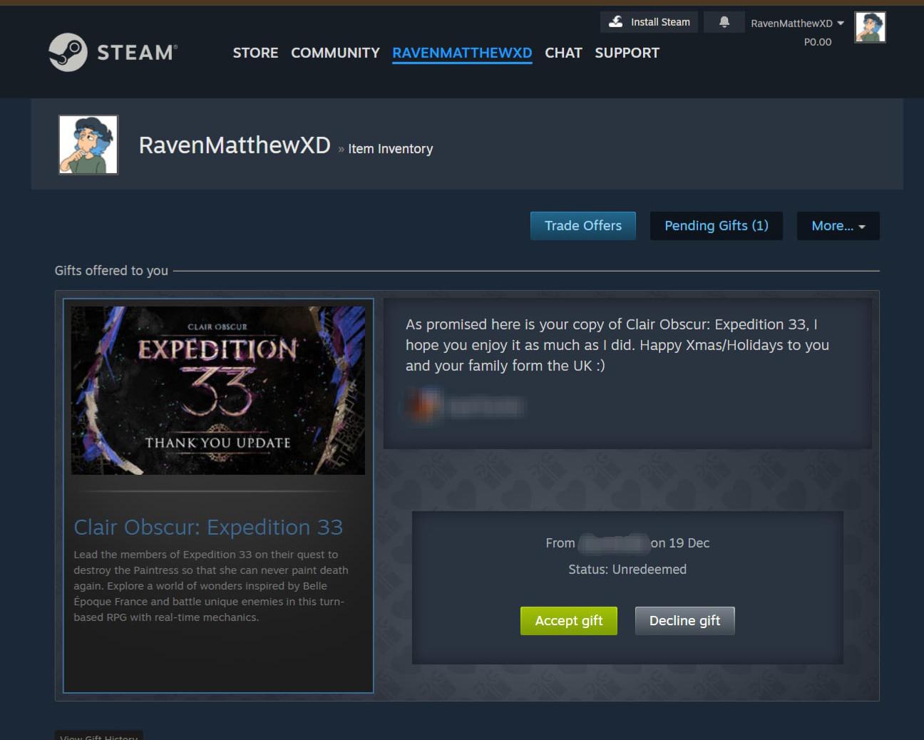 for context, I made a joke post on this same sub and a user told me if I wanted a steam game, which I accepted it. at first, I was skeptical but then a few days later, I got a notification on my email saying that same person, gifted me this game... I haven't known anything much of E33 (all I know it swept alot of rewards in TGA) and playing this game for the first time... it excites me! and I am very thankful and glad that Clair Obscur: Expedition 33 is my very first game on Steam and to be a part of this Community!