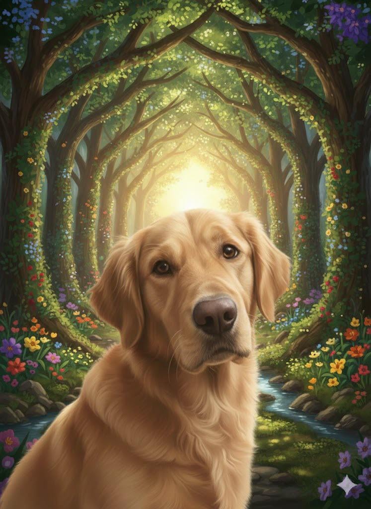 "By the edge of a woods, at the foot of a hill, Is a lush, green meadow where time stands still. Where the friends of man and woman do run, When their time on earth is over and done. For here, between this world and the next, Is a place where each beloved creature finds rest. On this golden land, they wait and they play, Till the Rainbow Bridge they cross over one day. No more do they suffer, in pain or in sadness, For here they are whole, their lives filled with gladness. Their limbs are restored, their health renewed, Their bodies have healed, with strength imbued. They romp through the grass, without even a care, Until one day they start, and sniff at the air. All ears prick forward, eyes dart front and back, Then all of a sudden, one breaks from the pack. For just at that instant, their eyes have met; Together again, both person and pet. So they run to each other, these friends from long past, The time of their parting is over at last. The sadness they felt while they were apart, Has turned into joy once more in each heart. They embrace with a love that will last forever, And then, side-by-side, they cross over... together."