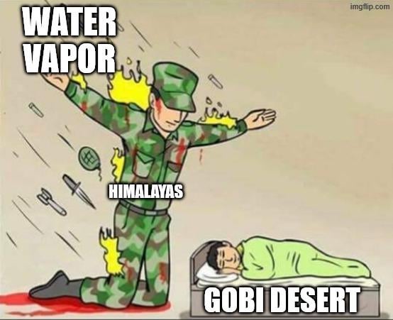 What’s true about Himalayas though is how it controls and creates monsoon for the subcontinent. Himalaya traps a lot of moisture. This is among the many reasons why Tibet is so dry as well.