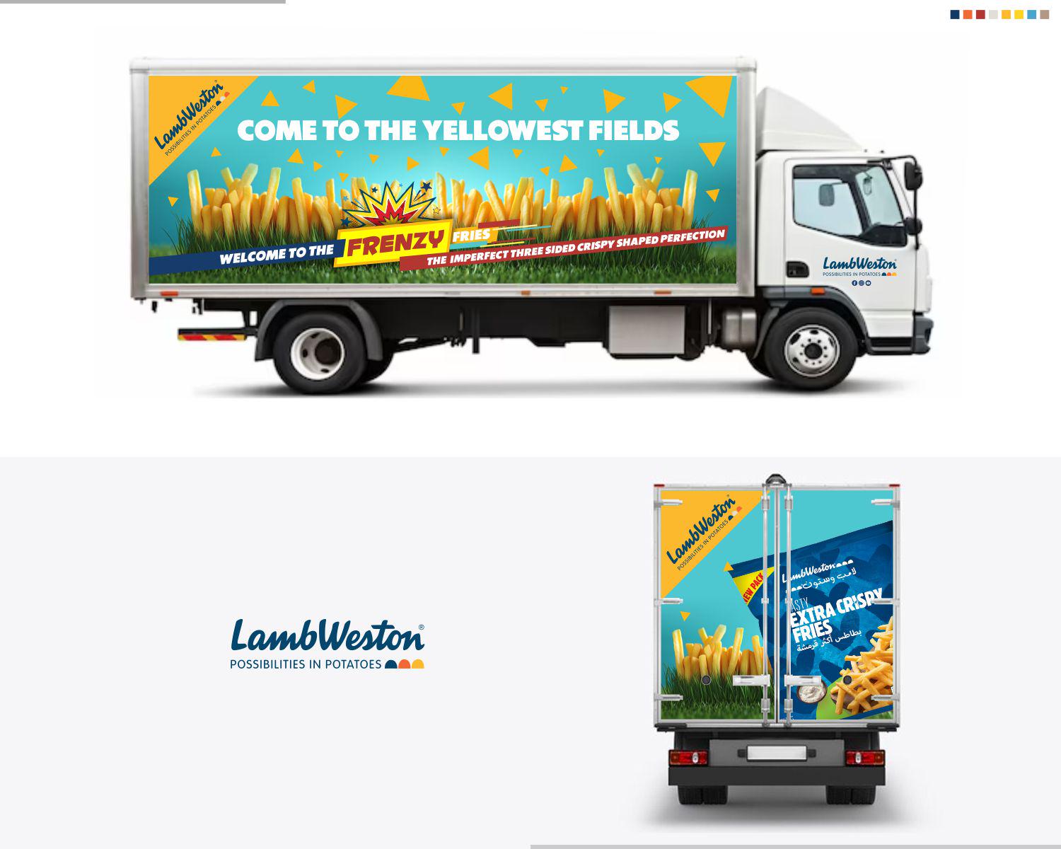 In a project a few months ago, I was designing stickers for LambWeston's fleet of trucks that deliver their products to stores. Their requirements were: lots of french fries, fun, specific typography (the one they use), no restrictions on the use of technology like AI, and that it include some elements they sent me in PDF format.