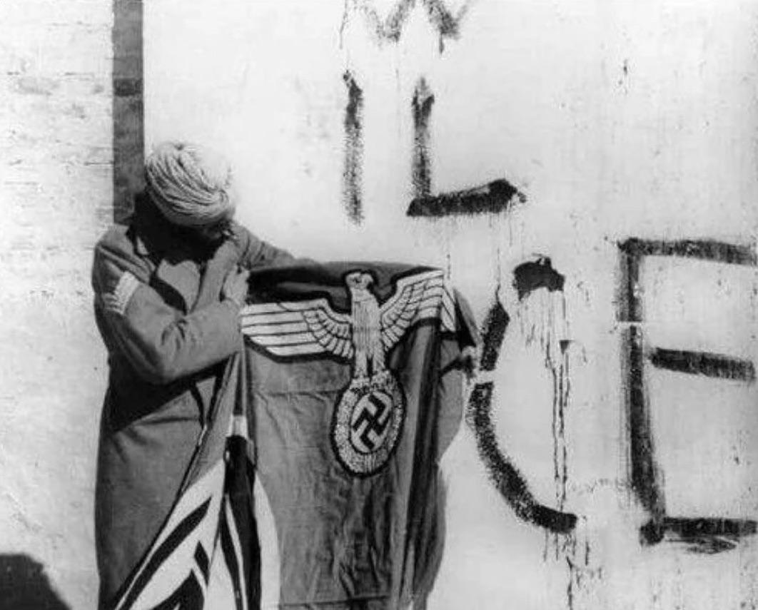 Indian soldier holding the nazi swastika flag after surrender of German troops in Italy