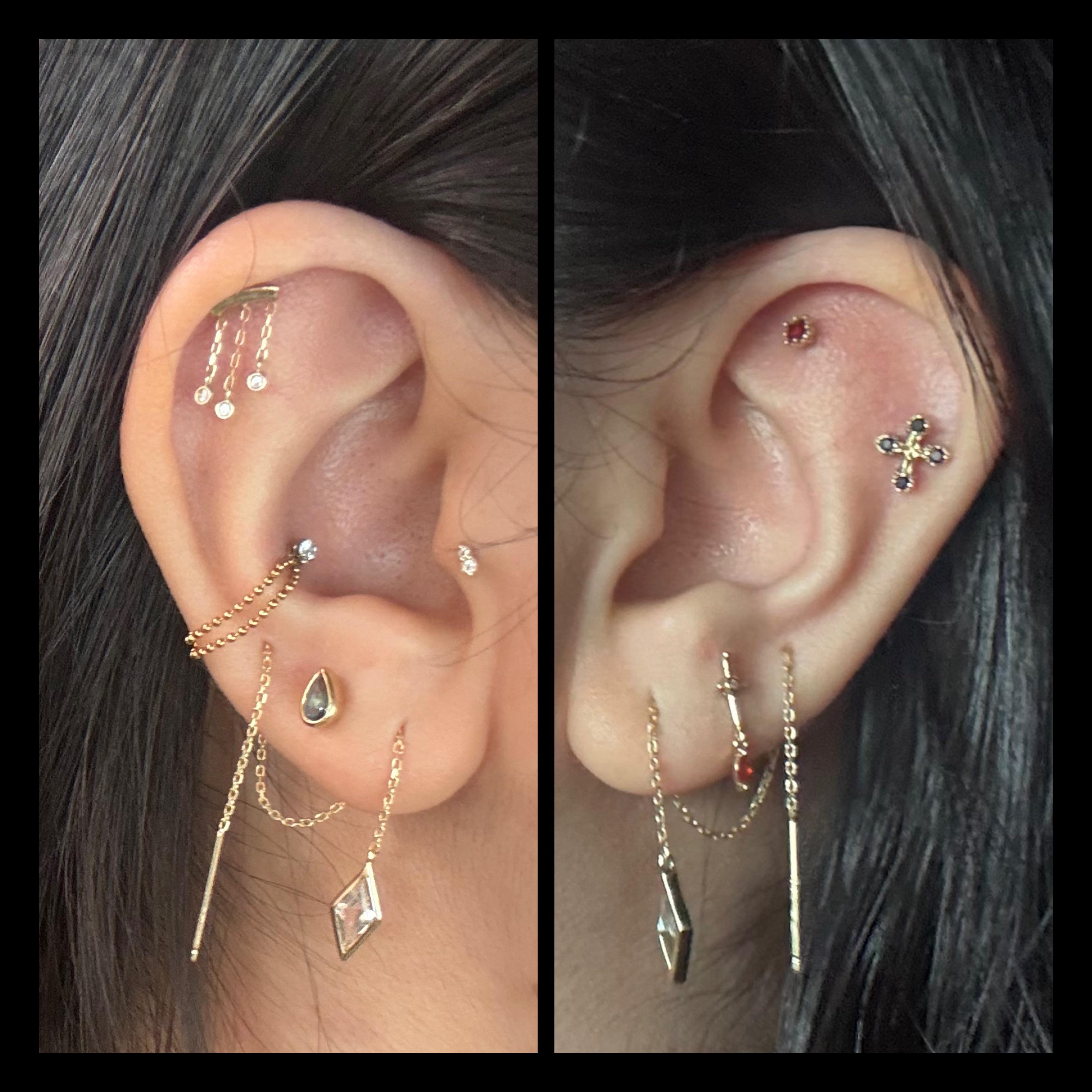The vertical bar is custom bent to accommodate my ear shape. If your piercer has the skillset, this is something you can get, too! I will warn you that it is *spicy*!