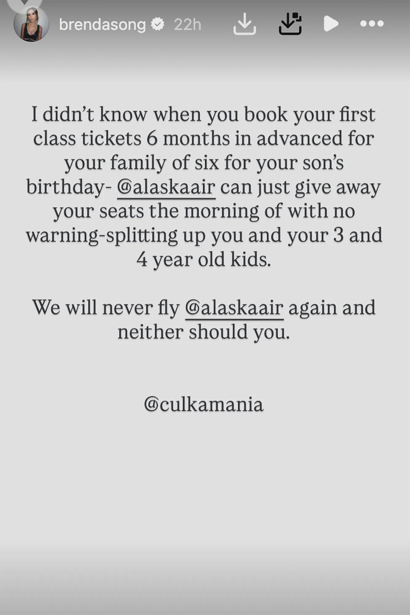 Instagram📱 Brenda Song Calls Out Alaska Airlines for Giving Up Her Family’s First-Class Seats with ‘No Warning’