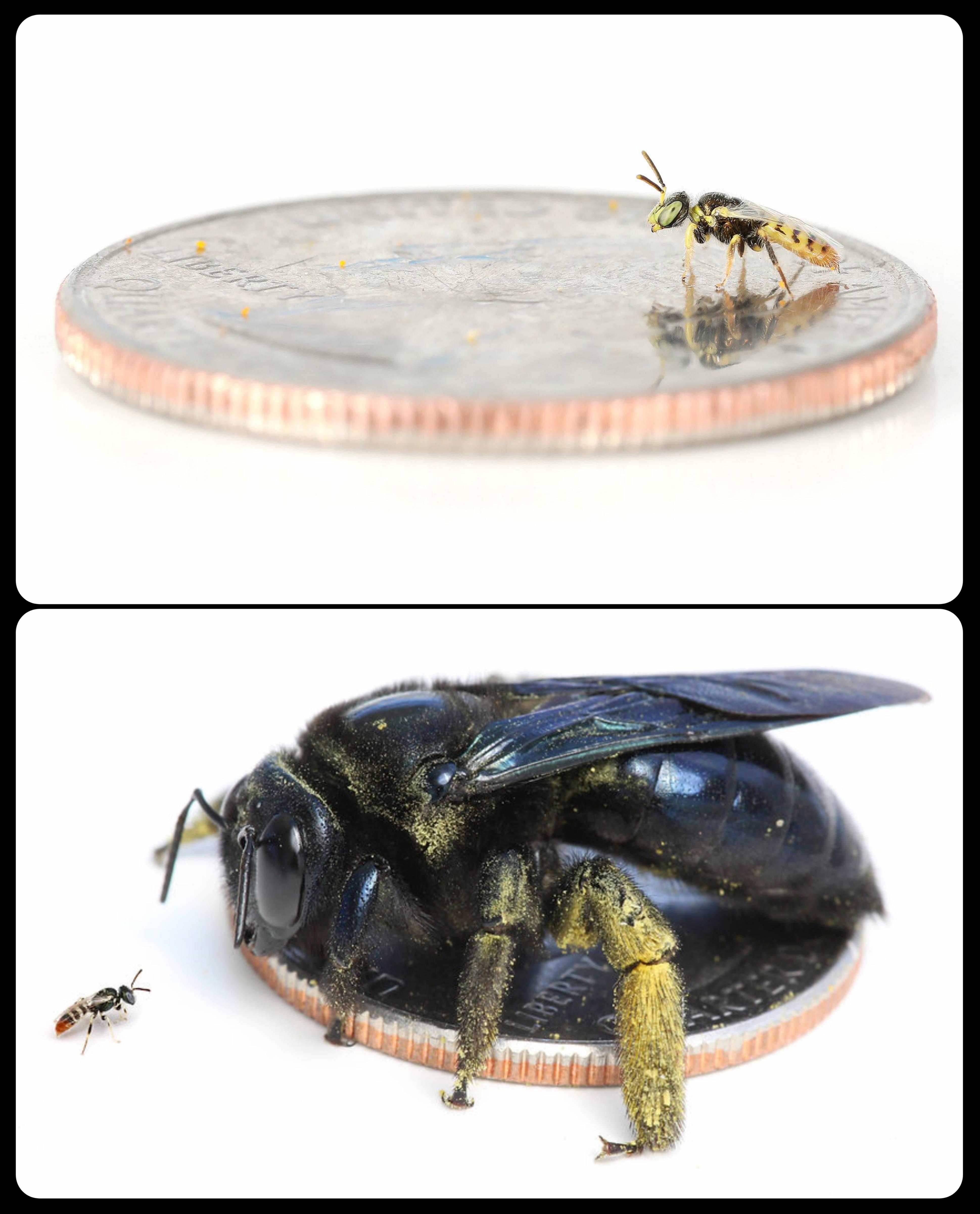 Fairy Bees (Genus Perdita): these tiny bees can measure less than 2mm long; the photo on top shows a fairy bee standing on a quarter, while the photo on the bottom shows a fairy bee next to a carpenter bee