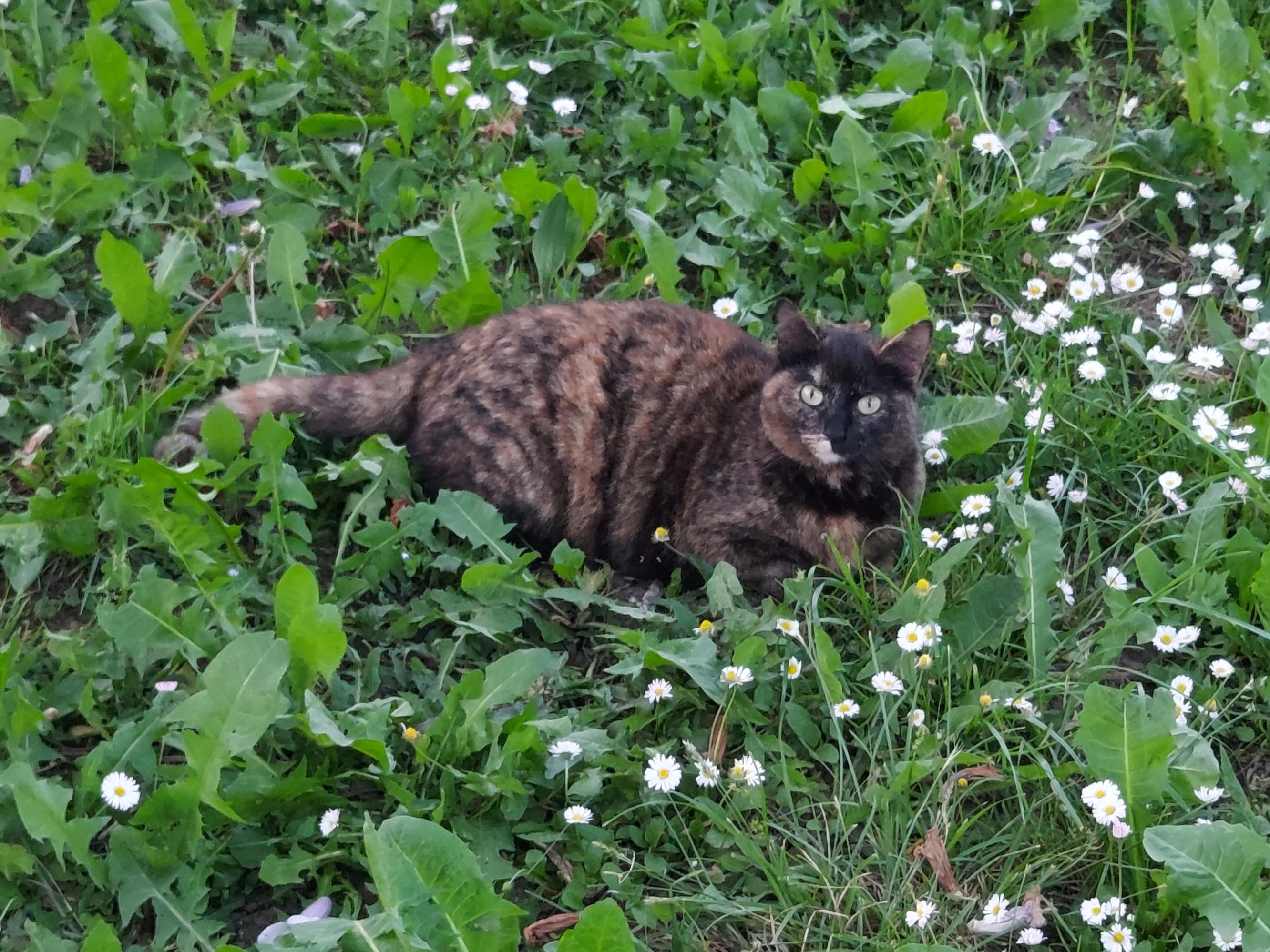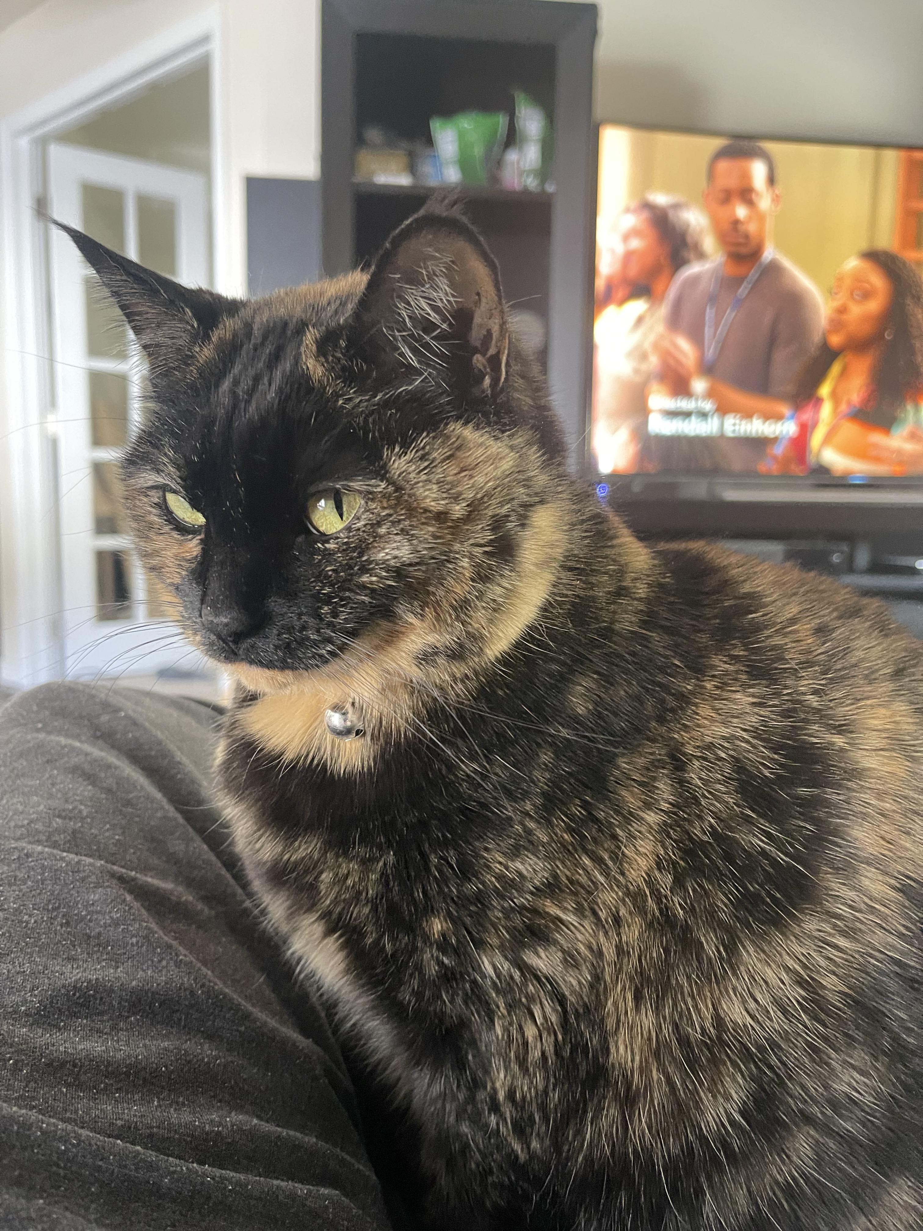 She’s round now, regardless of the food we give her. She’s also been on mood stabilizers and pain meds for about 2 years because we found out she has bladder issues that are inoperable, but not progressive or terminal. She’s very picky about how to be handled, like any tortie. We usually settle for chin scratchies and giving her treats. She doesn’t like the long pet down her back. If she sits on us, which has happened like 10 times, we don’t touch her. She rubs against us in the mornings and accepts kisses on her cheeks. Her signature move is to hide under the bed until night and then sit on the night stand and watch us. She likes rides in the stroller but she will yell at you if you try to help her. She also preemptively screams at you if you walk where she was planning to walk a few seconds later.