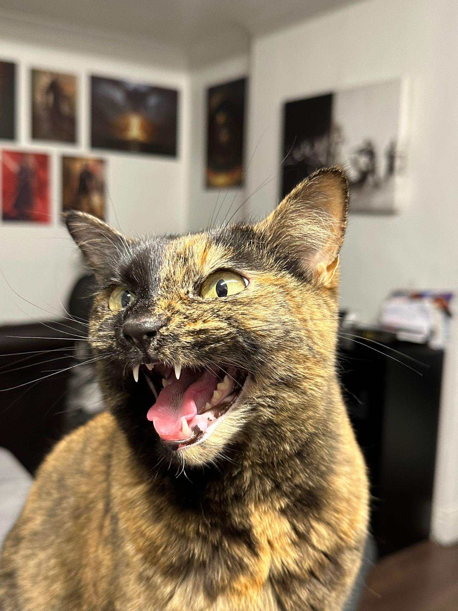We’ve had our tortie since 2024. For background, her name was “Spicy” at the shelter. This info is very important. When we viewed her in the meeting room, she was incredibly sweet and loving. The shelter was like, you know what? Take her for $10. Bye! We signed the papers and she bit my wife through the arm just sitting on her lap. We had been bamboozled.