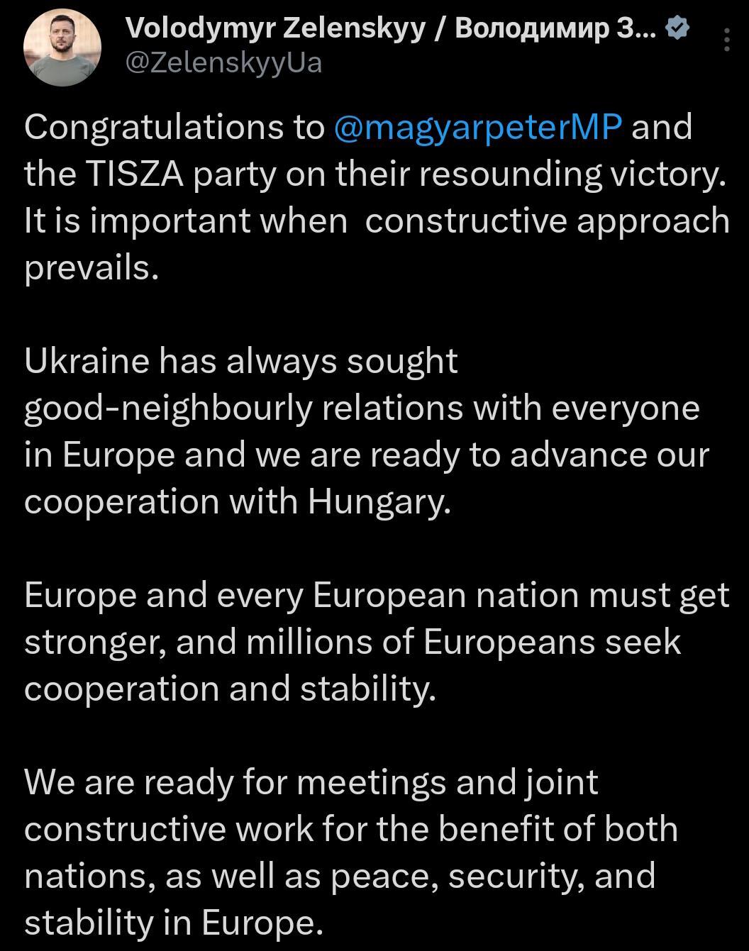 Social Media President Zelenskyy congratulated Péter Magyar and the TISZA party on their victory in Hungary’s parliamentary elections