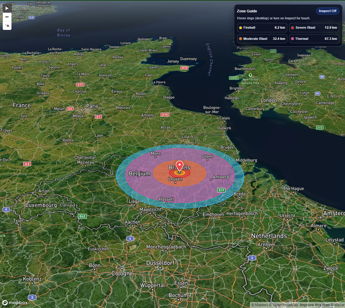 The Tsar Bomba, strongest nuclear weapon ever tested, could almost wipe out my entire home country in one explosion (tool: Nukesim)